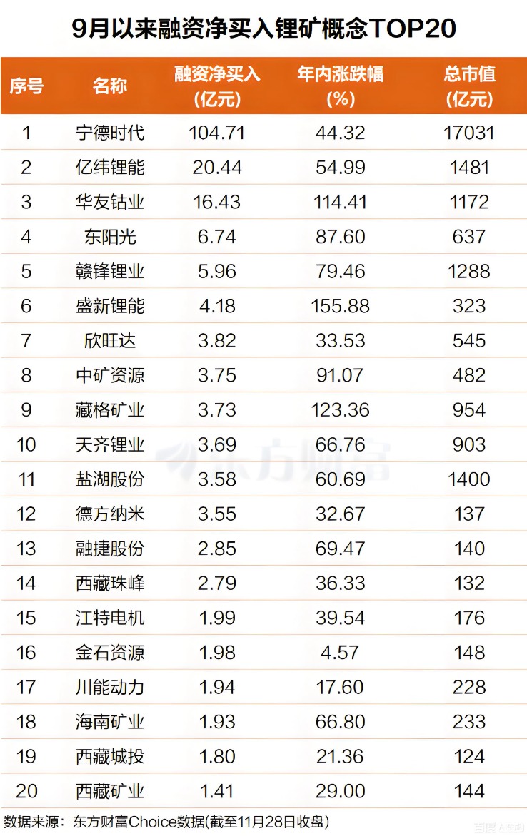东方财富Choice数据显示,自今年9月以来,杠杆资金抢筹多只锂矿概念股,净买入额前20的个股总计净买入超197亿元。