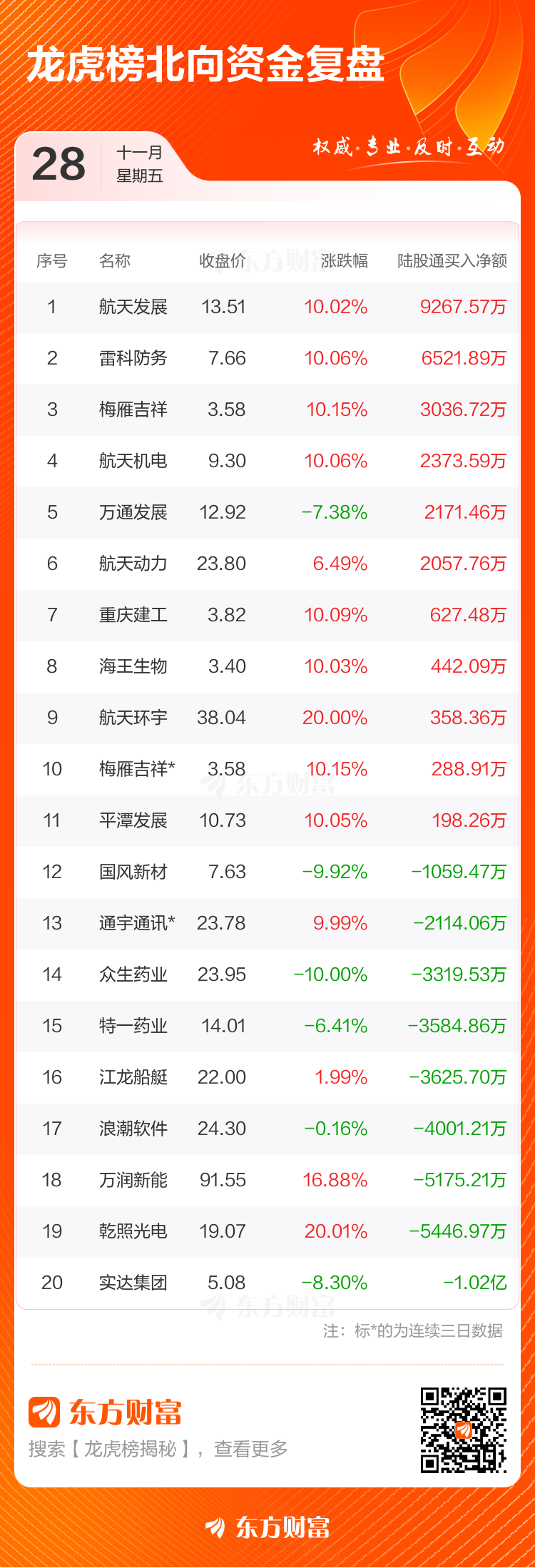 11月28日龙虎榜:航天发展净买入额最高,万通发展“陈小群”净买入1.11亿元