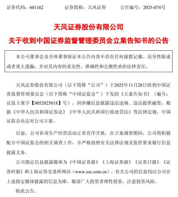 天风证券公告称,公司于2025年11月28日收到中国证监会下发的《立案告知书》。因涉嫌信息披露违法违规、违法提供融资,中国证监会决定对公司立案。目前,公司各项生产经营活动正常有序开展。