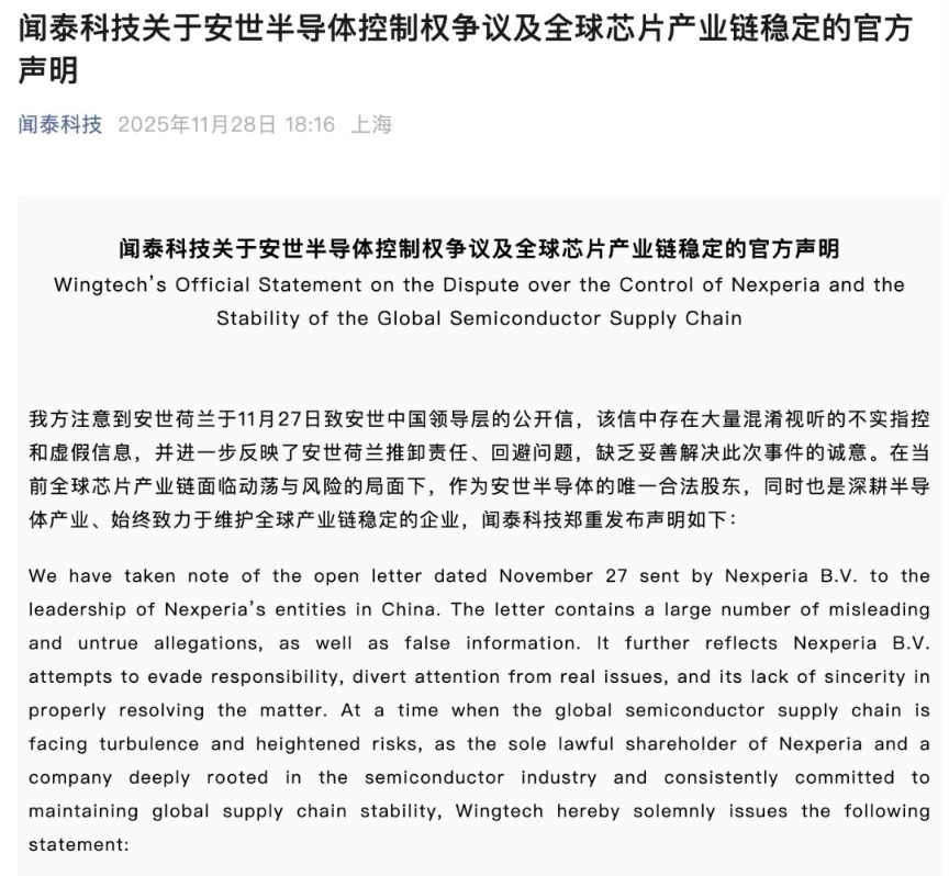 闻泰科技声明:安世半导体控制权争议影响全球供应链