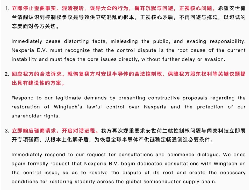 1.立即停止歪曲事实、混淆视听、误导大众的行为,摒弃沉默与回避,正视核心问题。希望安世荷兰清醒认识到控制权争议是导致供应链混乱的根本,正视核心矛盾,不再回避与拖延,以坦诚的态度面对各方关切。
