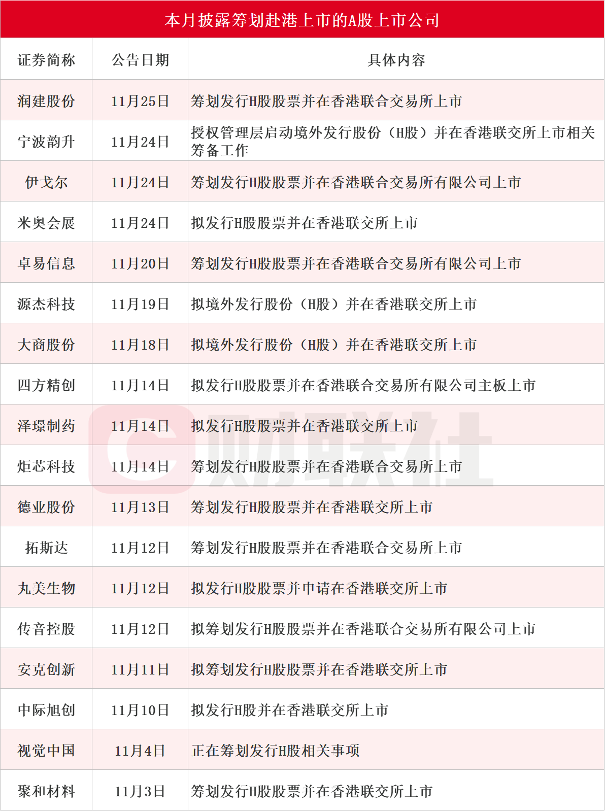 近期,A股公司赴港上市热潮延续。据财联社不完全统计,截至发稿,11月迄今(11.1-11.29)包括润建股份、宁波韵升、伊戈尔、米奥会展、卓易信息、源杰科技、大商股份、四方精创、泽璟制药、炬芯科技、德业股份、拓斯达、丸美生物、传音控股、安克创新、中际旭创、视觉中国和聚和材料在内的18家A股上市公司披露筹划赴港上市。其中,中际旭创11月10日公告,拟发行H股并在香港联交所上市。