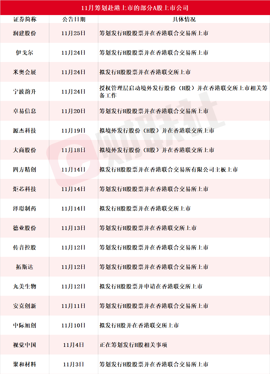 A股公司赴港上市热潮持续。据财联社不完全统计,11月包括润建股份、伊戈尔、米奥会展、宁波韵升、卓易信息、源杰科技、大商股份、四方精创、炬芯科技、泽璟制药、德业股份、传音控股、拓斯达、丸美生物、安克创新、中际旭创、视觉中国、聚和材料在内的18家A股上市公司披露筹划赴港上市,详细情况见下图: