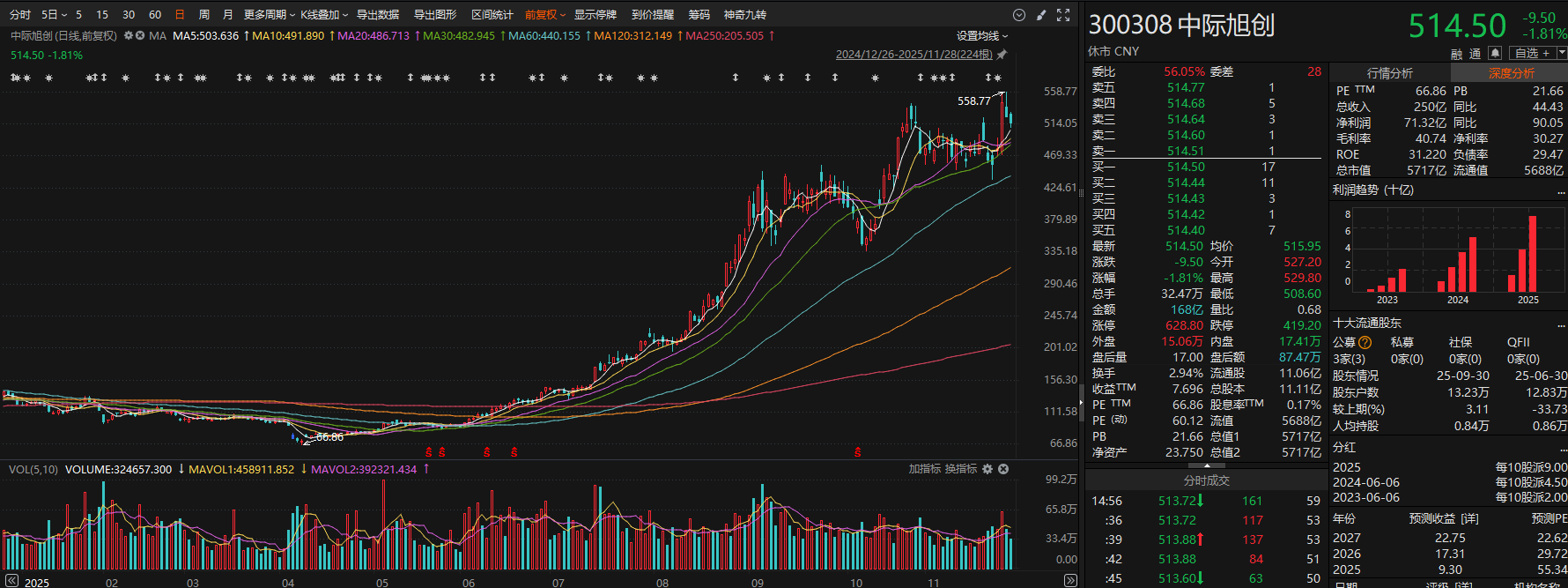 光模块龙头中际旭创11月10日公告称,公司召开董事会,公司拟在境外发行股份(H股)并在香港联交所上市,公司董事会授权公司管理层启动本次H股上市的前期筹备工作,授权期限为自董事会审议通过之日起12个月内。公司表示,本次筹划发行H股并在香港联交所上市,目的是为持续推进公司国际化战略和全球化布局,增强公司的境外融资能力,进一步提升公司治理水平和核心竞争力。据悉,中际旭创子公司苏州旭创已多年蝉联全球市场份额第一的宝座。公司客户群涵盖谷歌、亚马逊、微软、Meta等全球顶级云服务商和互联网巨头,是AI算力基础设施建设的核心供应商。二级市场方面,中际旭创今年4月低点迄今股价累计最大涨幅达735.73%。
