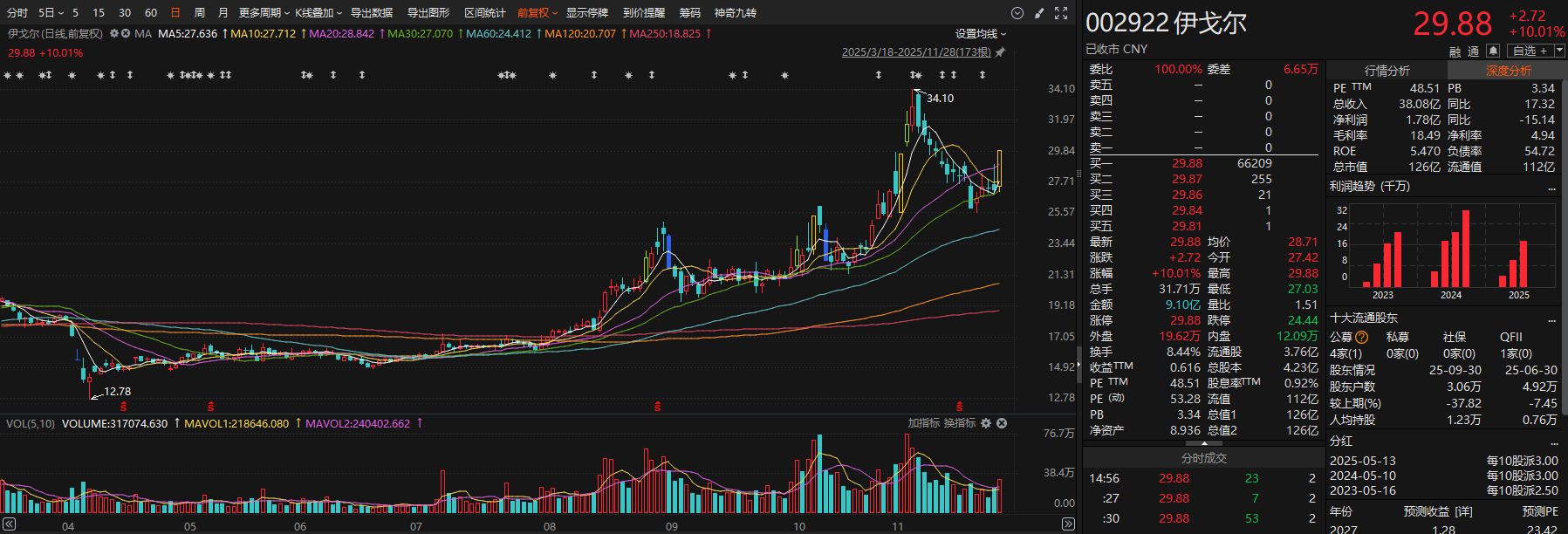伊戈尔11月24日公告,公司拟发行境外上市股份(H股)并申请在香港联合交易所有限公司主板挂牌上市,以推进国际化战略和提升国际形象及综合竞争力。相关议案已通过董事会审议,尚需提交股东会审议。公司正积极推进相关工作,但发行上市存在较大不确定性,将履行信息披露义务并提醒投资者注意风险。二级市场方面,伊戈尔周五收盘涨停,拉长时间看,自今年4月低点迄今股价累计最大涨幅达166.82%。