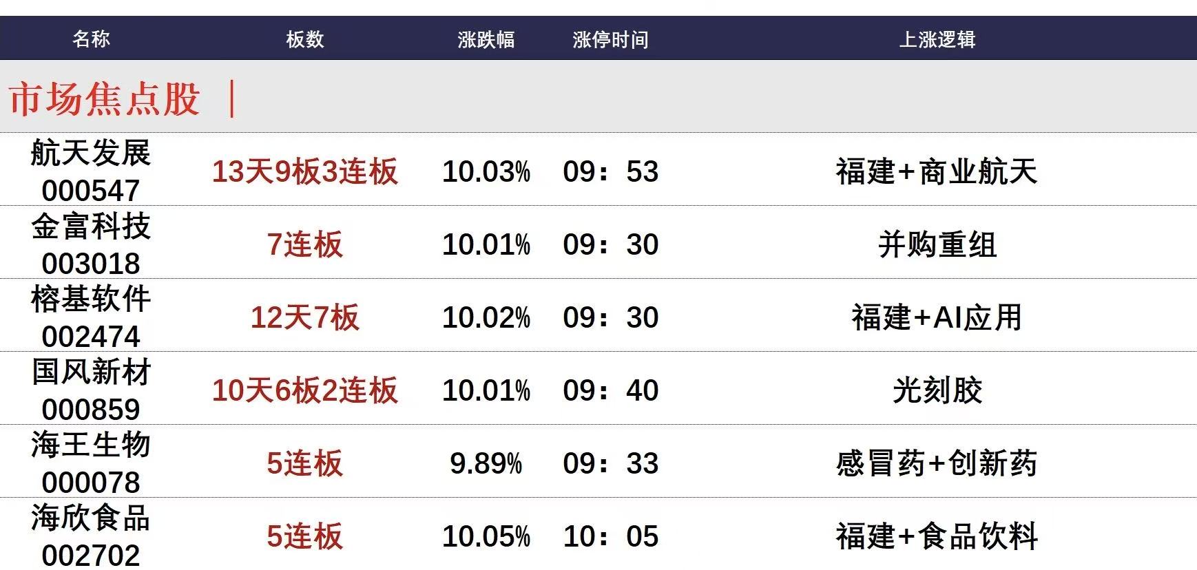 今日午盘全市场共34股涨停,连板股总数14只,17股封板未遂,封板率为67%(不含ST股、退市股)。焦点股方面,福建本地股反复活跃,航天发展13天9板、榕基软件12天7板、海欣食品5连板,并购重组的金富科技7连板,光刻胶概念股国风新材10天6板。