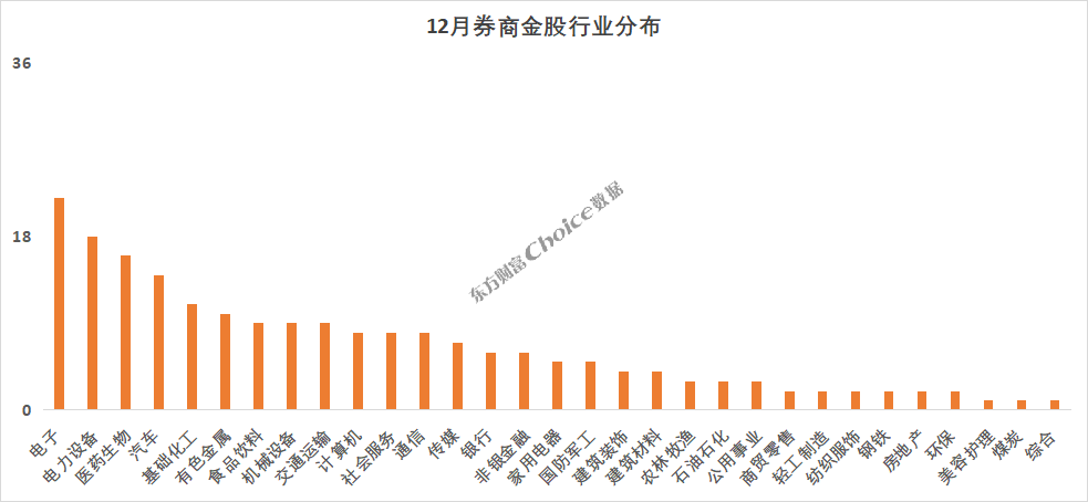在券商12月金股名单中,电子行业被推荐数量最多,共有22只,包括寒武纪、兆易创新、北方华创、长盈精密等;其次为电力设备和医药生物行业,分别有18只、16只。