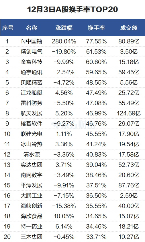 当天换手率最高的个股为N中国铀,全天换手率77.55%。精创电气紧随其后,全天换手率61.53%。