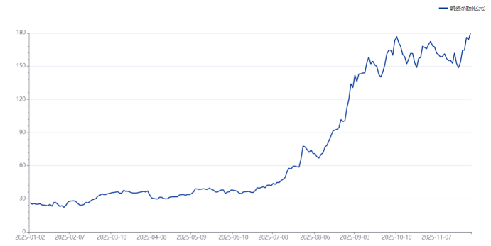 从融资客动向上看,新易盛近期获其重点加仓。截至12月2日数据,新易盛目前融资余额达179.78亿元,为其上市以来的最高纪录,同时在此轮7连涨行情前夕(148.55亿元)累计增长近31.3亿元,融资余额增幅近21.1%。其中,在11月28日、11月26日,新易盛单日融资净买额分别达11.71亿元、10.72亿元,在历史行情中位列第三、第六位。