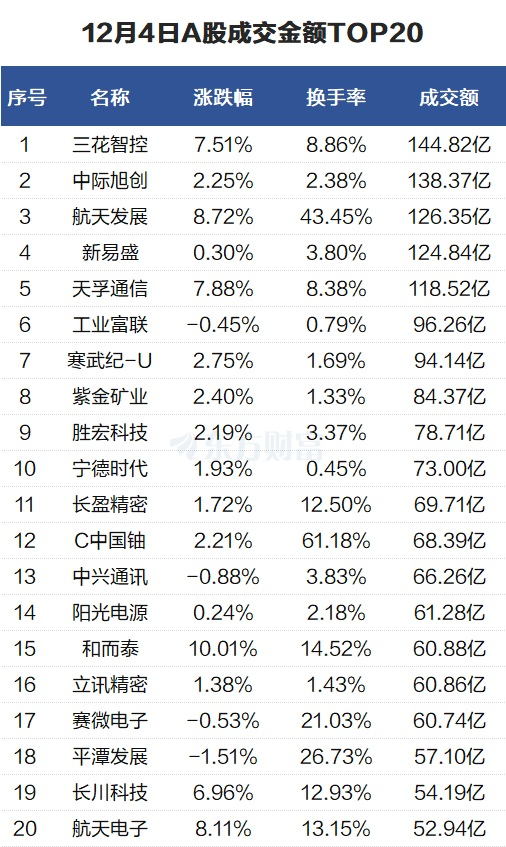 12月4日,上证指数跌0.06%,收报3875.79点;深证成指涨0.4%,收报13006.72点;创业板指涨1.01%,收报3067.48点。