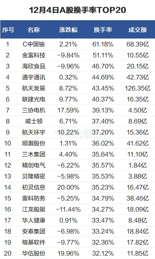 当天换手率最高的个股为C中国铀,全天换手率61.18%。金富科技紧随其后,全天换手率51.11%。