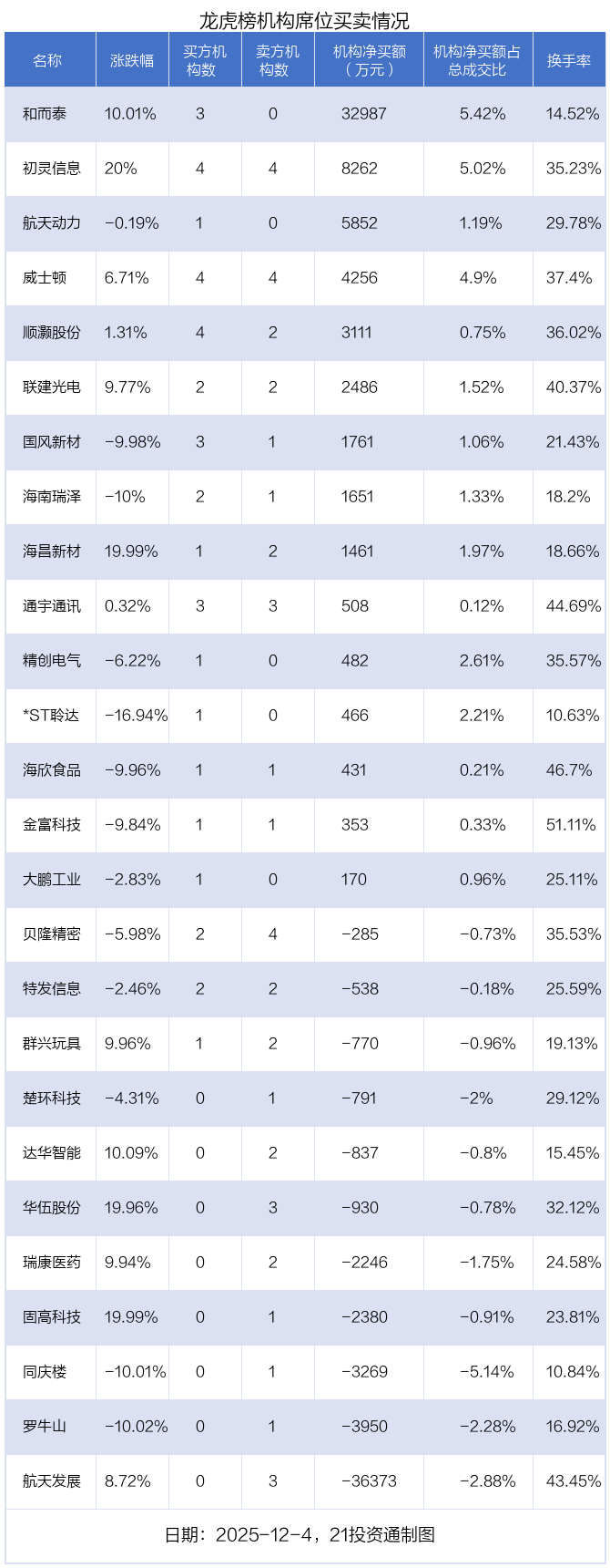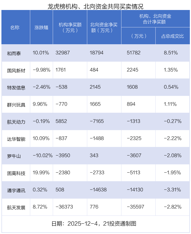 【股市热点】龙虎榜揭秘:和而泰获机构与北向资金共同抢筹