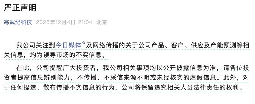 12月4日晚间,寒武纪发布严正声明称,公司关注到今日媒体及网络传播的关于公司产品、客户、供应及产能预测等相关信息,均为误导市场的不实信息。寒武纪提醒广大投资者,公司相关事项均以公开披露信息为准,请各位投资者提高信息辨别能力,不传播、不采信来源不明或未经核实的虚假信息。此外,对于任何捏造、散布传播不实信息的行为,公司将保留追究相关人员法律责任的权利。