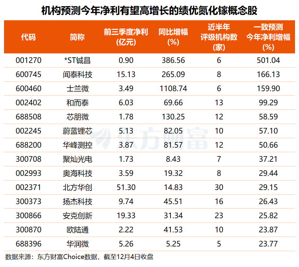 业绩方面,共有33只氮化镓概念股前三季度净利润实现正增长(含扭亏为盈),占比近七成。其中,赛微电子同比增幅居首,达1438.05%,士兰微净利增幅也高达11倍,闻泰科技、芯朋微等5股净利均实现翻倍增长。