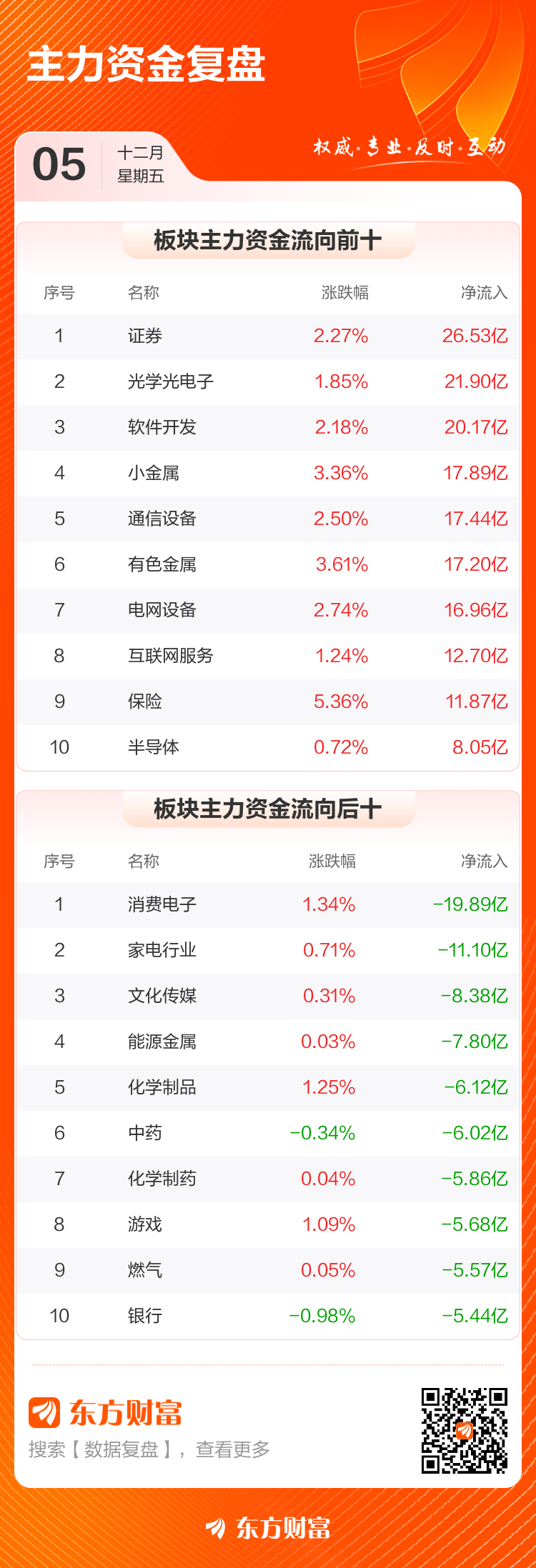 12月5日,沪指涨0.7%,深成指涨1.08%,创业板指涨1.36%。两市成交额1.73万亿,较上个交易日放量1768亿。数据显示,今日大盘主力资金净流入123.17亿。证券、光学光电子、软件开发等板块主力资金流入排名居前,其中证券净流入26.53亿元。