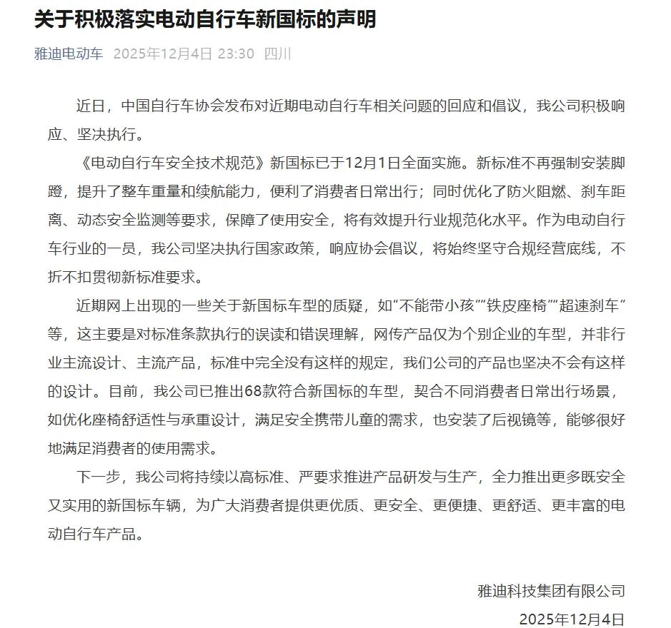12月4日,雅迪科技集团有限公司发布声明: