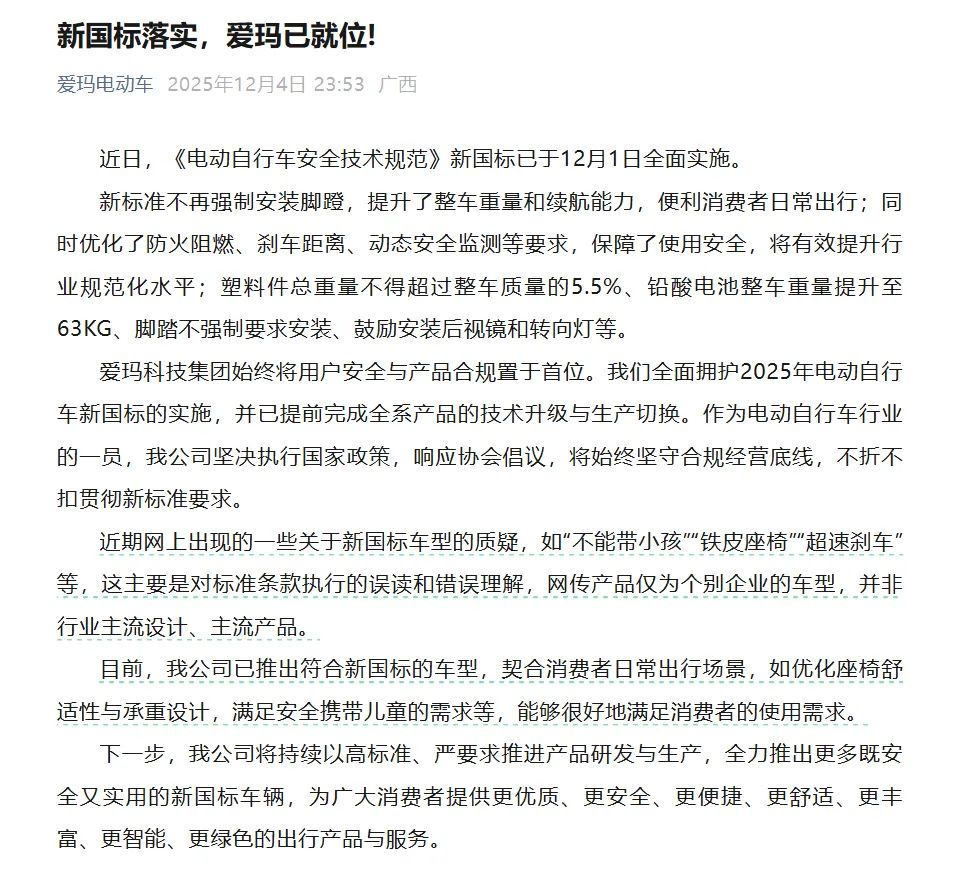 爱玛电动车发文《新国标落实,爱玛已就位!》: