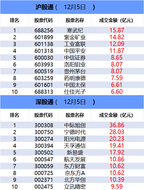 从沪股通前十大成交个股来看,寒武纪位居首位;紫金矿业和工业富联分居二、三位。
