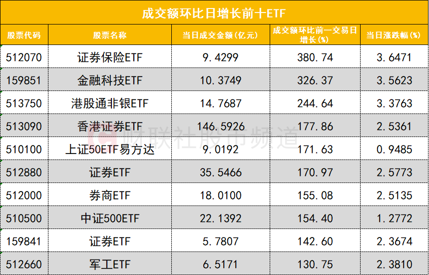 从成交额前十的ETF来看,香港证券ETF(513090)成交额位居首位,A500ETF基金(512050)成交额位居次席。
