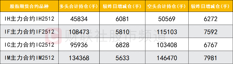 四大期指主力合约中,IH、IF、IC、IM合约多空双方均加仓,IF、IM合约空头加仓数量较多。