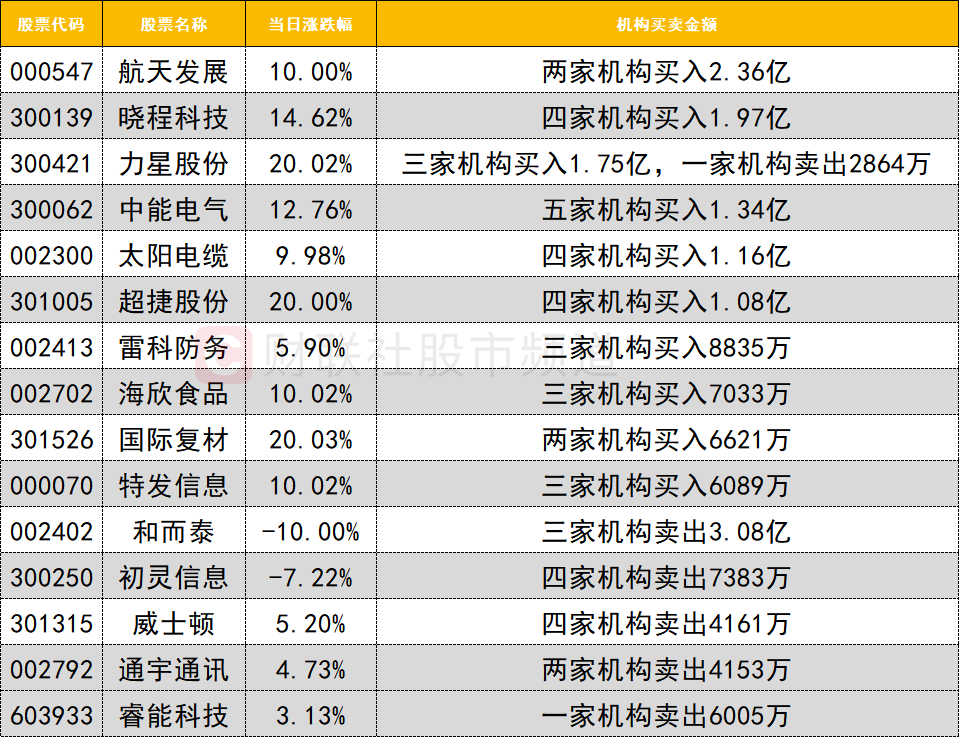 今日龙虎榜机构活跃度明显提升,买入方面,航天发展走出6天4板,获两家机构买入2.36亿。黄金概念股晓程科技今日大涨,获四家机构买入1.97亿。
