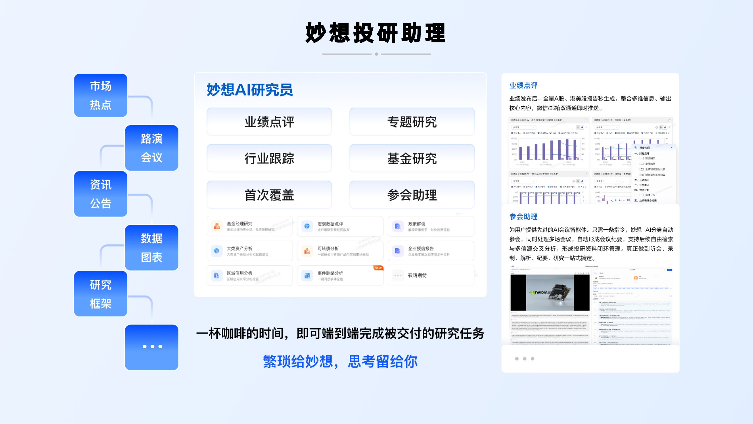 (图为妙想AI研究员) 以下为曹巍演讲纪要: 一、推理引领未来:重塑金融投研生产力 曹巍博士强调,AI已经转向思考能力的高阶比拼。通过构建金融专业思维链,妙想可在短时间内完成多维度信息整合与深度分析,生成高质量投研结论,显著降低研究门槛、提升决策效率。 二、妙想AI研究员:一杯咖啡的时间,端到端完成研究任务 在妙想投研助理中打造的“AI研究员”实现全市场自动化覆盖:无论是业绩点评还是专题研究,系统可在数分钟内完成深度研究报告生成,并通过订阅式推送机制,精准触达投资者与专业研究人员,打破传统投研的时间与空间限制。 三、金融智能体:全天候全链路自主闭环 曹巍博士现场以“主题轮动”为核心案例,展示了妙想深度研究模式:通过实时扫描全市场热点、自动挖掘关联标的、开展多维度数据分析,为投资者提供“热点识别-标的筛选-定量分析-趋势评估”的全链路支持。这套自动化端到端流程,可将从业人员的业务逻辑沉淀为金融机构的核心数据资产。 四、范式迁移:AI从辅助工具升级为核心生产力 曹巍博士指出,AI正推动金融研究发生深刻变革:从静态的深度报告生成,到每天根据市场信息动态更新研究框架,再到金融智能体自主制定并执行长期行动计划。这一转变标志着AI正从单纯的辅助工具迈向推动业务变革的核心生产力。