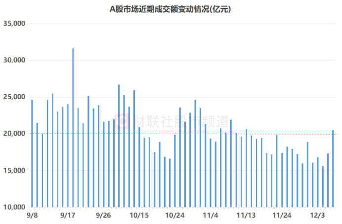 自11月中旬以来,A股成交额持续下滑,其于12月4日一度录得1.56万亿元,创8月4日以来近4个月新低,同时,其当周(12月1日至5日)日均成交额1.70万亿元,为7月7日至11日当周以来近5个月低点。不过,随着市场今日热度提升,其成交额规模也时隔16个交易日重返2万亿元关口。