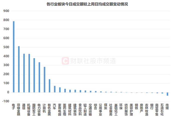 按行业统计,31个申万一级板块中,共有23个板块今日成交额较上周日均成交额有所增长,占比近74.2%。其中,电子、非银金融、通信、机械设备板块热度提升明显,成交额分别增长787亿元、512亿元、428亿元、425亿元。同时,国防军工、电力设备、计算机等板块成交额也有明显增长,而传媒、石油石化、商贸零售等板块今日成交额则略有缩量。