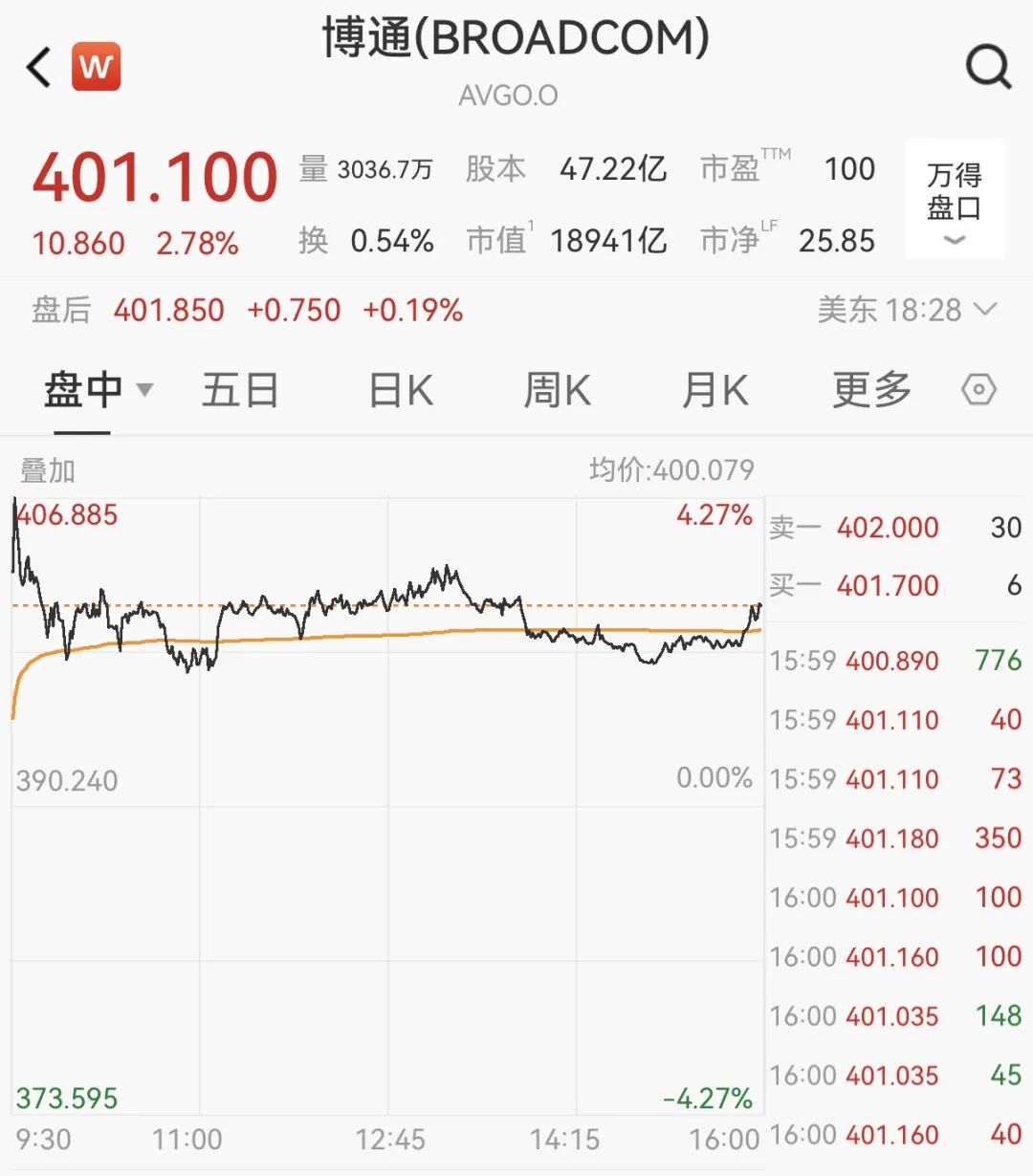 芯片巨头博通股价涨近3%,报401.1美元/股,创历史新高,市值达18941亿美元。微软正与博通商讨定制芯片合作。迈威尔科技为争取Meta更多业务,已同意减免部分芯片设计前期工程费用,Meta计划于2027年推出该定制芯片。