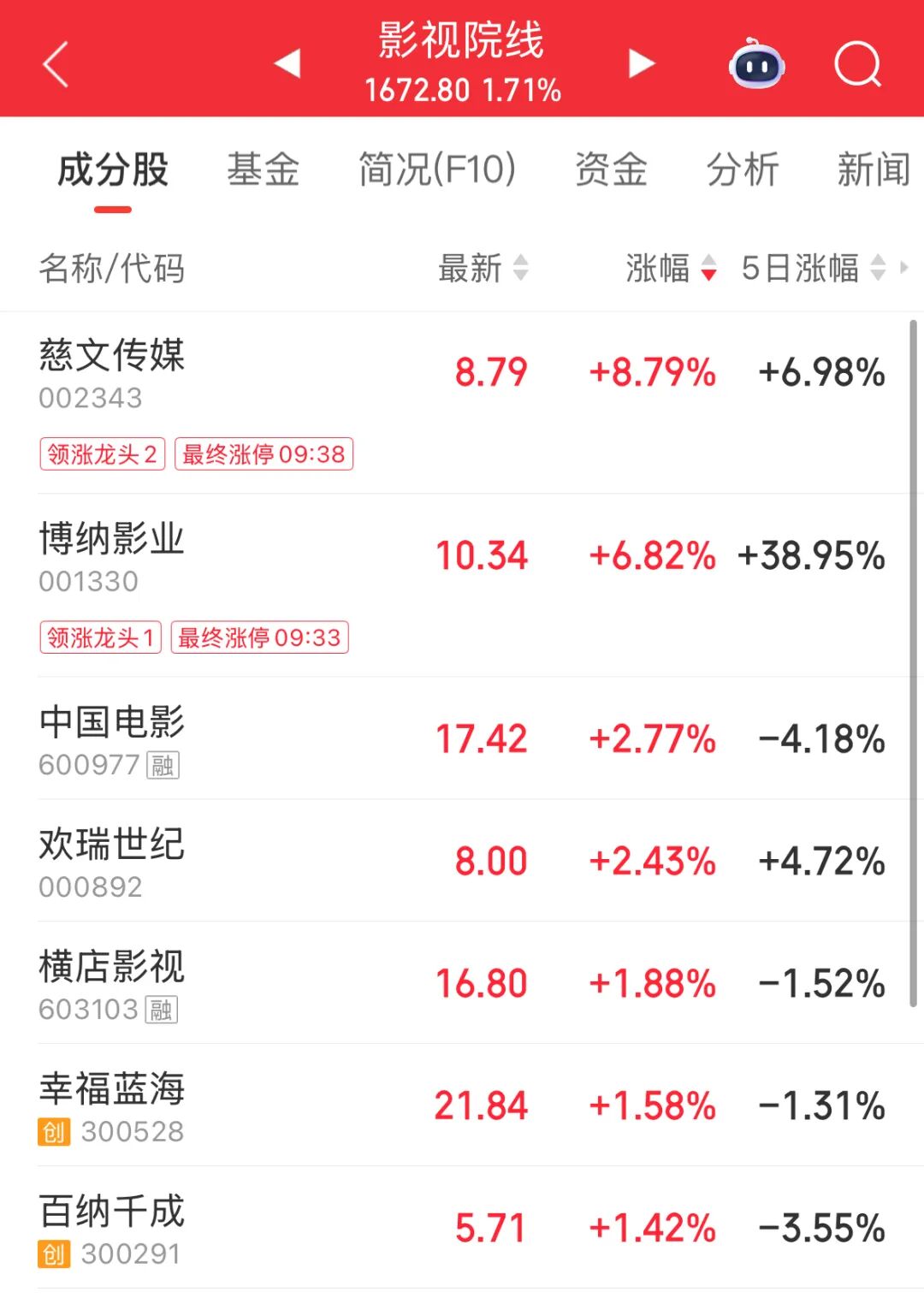 影视板块盘初活跃,慈文传媒、博纳影业触及涨停,中国电影、幸福蓝海、欢瑞世纪、横店影视等跟涨。消息面上,灯塔专业版数据显示,截至12月8日,《疯狂动物城2》在中国内地的票房已突破30亿元。