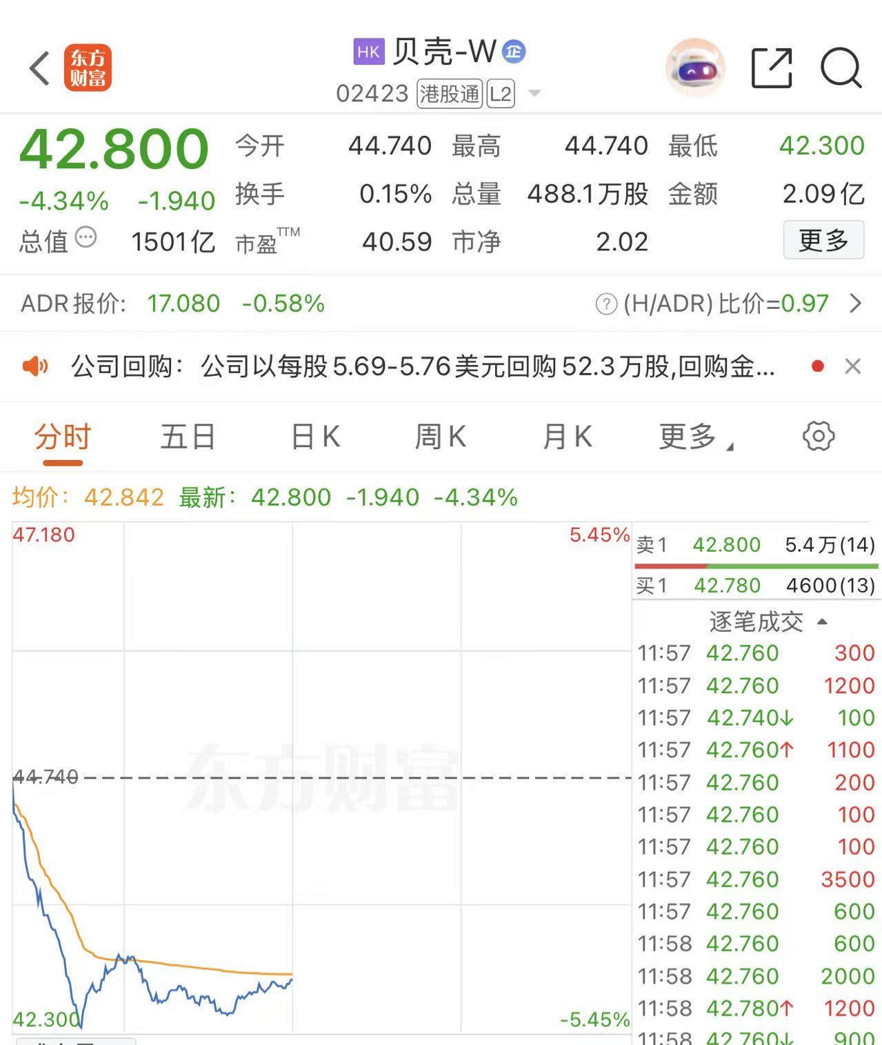 12月9日,贝壳-W(02423)股价跳水,一度跌超5%,午间收盘跌4.34%报42.800港元/股。
