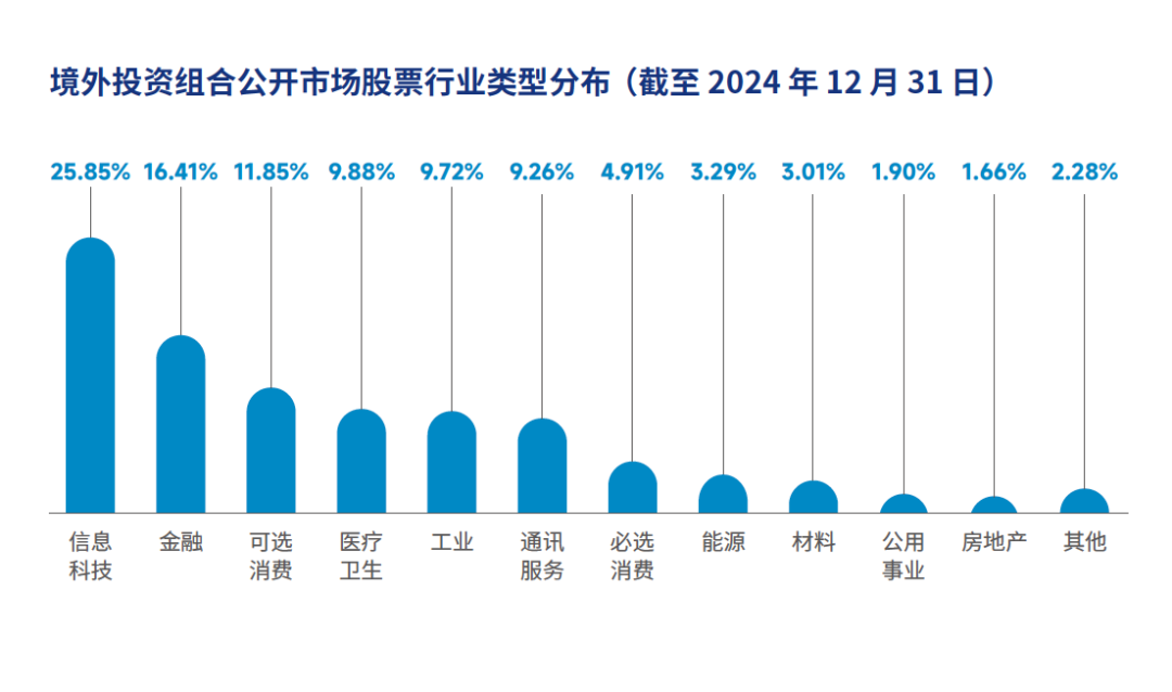 截至2024年末,中投公司境外投资组合中,信息科技行业占比靠前,具体排名前五的行业还包括金融、可选消费、医疗卫生、工业。