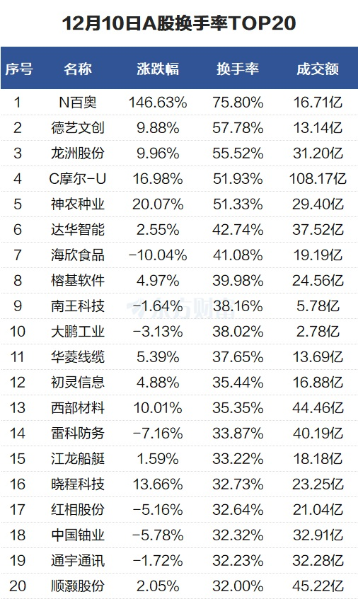 当天换手率最高的个股为N百奥,全天换手率75.8%。德艺文创紧随其后,全天换手率57.78%。