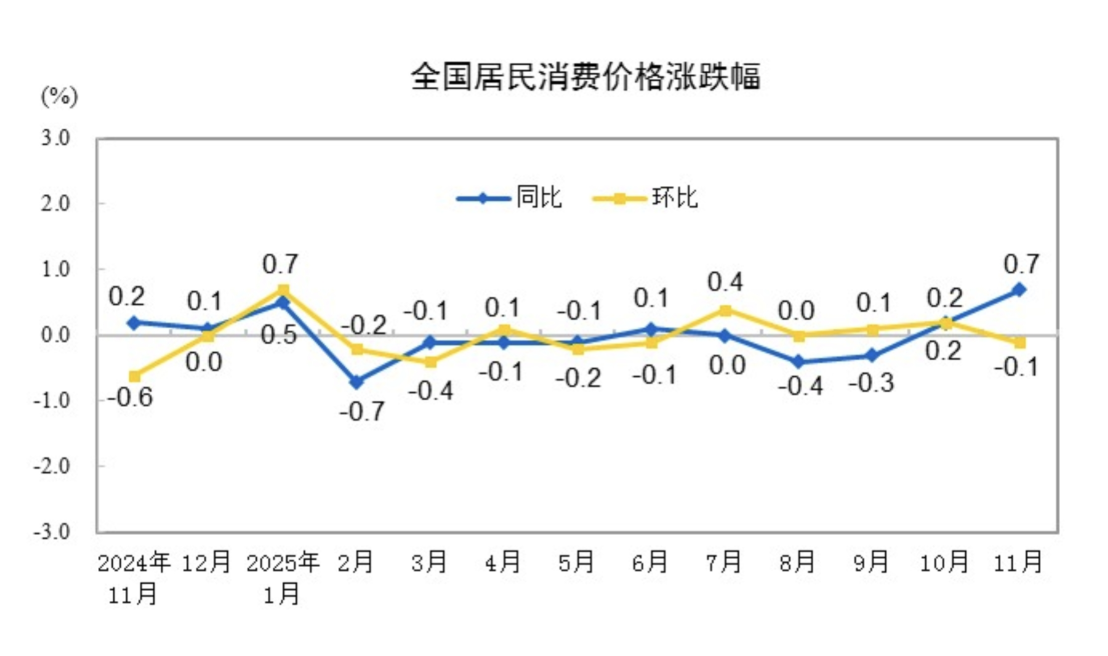 国家统计局12月10日发布的数据显示,11月CPI同比上涨0.7%,涨幅比上月扩大0.5个百分点;CPI环比由增长0.2%转为下降0.1%。PPI环比上涨0.1%,连续两个月上涨;PPI同比下降2.2%,降幅比上月扩大0.1个百分点。