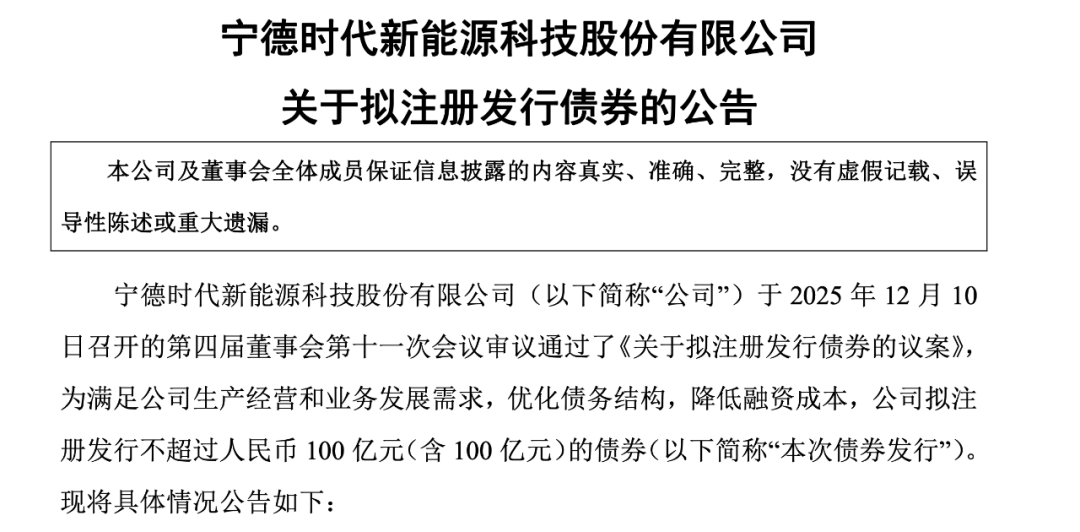 12月10日晚,宁德时代发布公告称,为满足公司生产经营和业务发展需求,优化债务结构,降低融资成本,公司拟注册发行不超过100亿元(含100亿元)的债券。