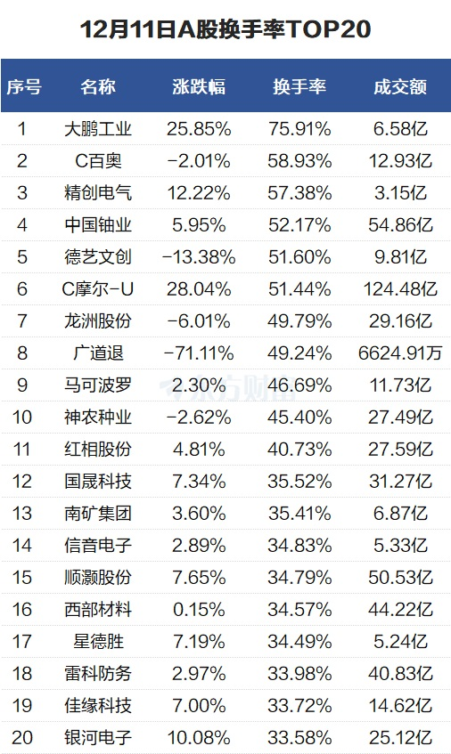 当天换手率最高的个股为大鹏工业,全天换手率75.91%。C百奥紧随其后,全天换手率58.93%。
