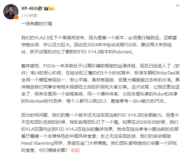 如果明年8月小鹏汽车的VLA(Vision-Language-Action Model)达不到特斯拉FSDV14.2在硅谷的整体效果,小鹏智驾负责人刘先明将在金门大桥裸跑;如果达成,则参考小鹏当前的总部餐厅,在硅谷筹建一个中国风味食堂。