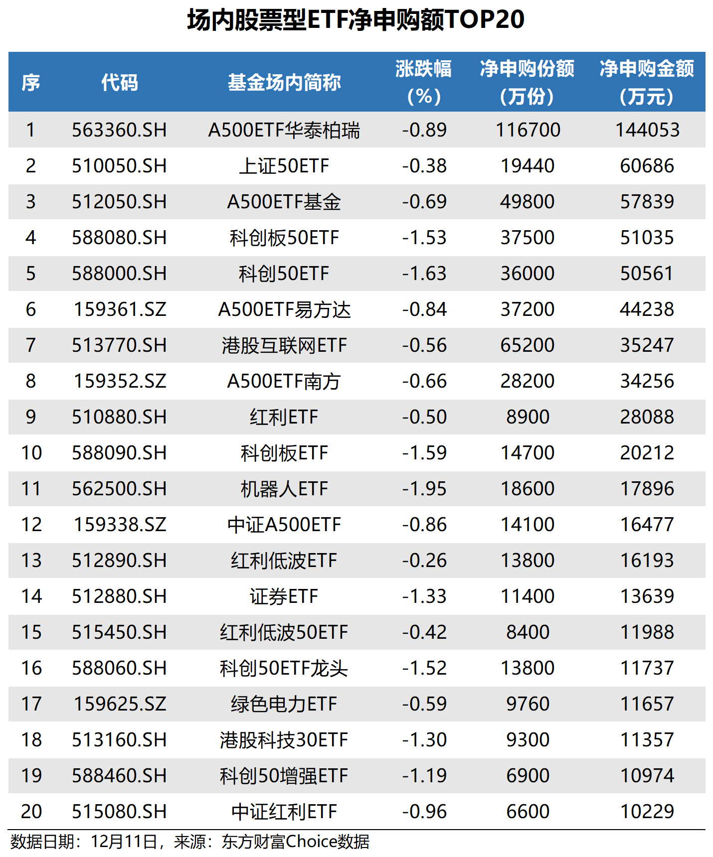 昨日(12月11日),东方财富Choice数据显示,场内股票型ETF净申购36.24亿份;其中,沪市股票型ETF净申购29.65亿份,深市股票型ETF净申购6.59亿份。以最新净值计,昨日市场净申购34.8亿元。