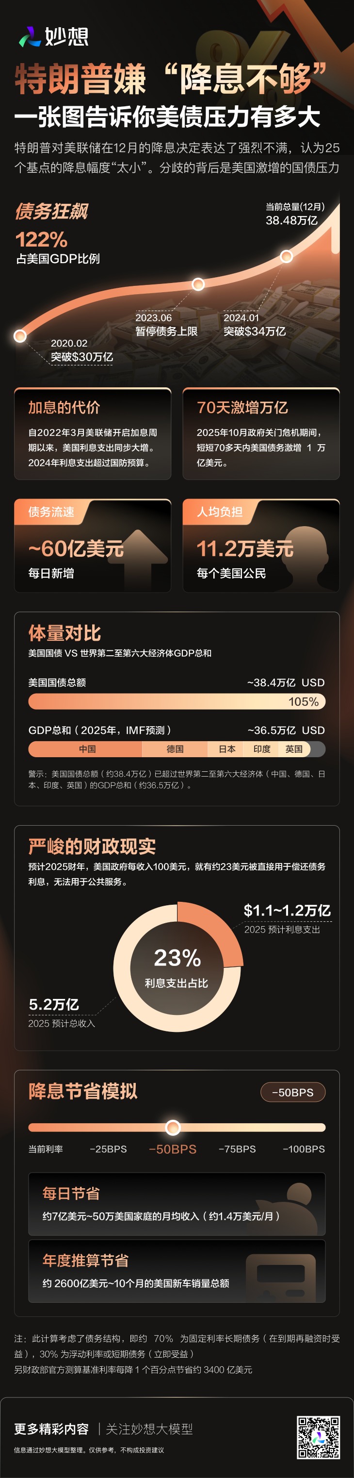 近期,特朗普对美联储12月宣布的降息25个基点表示强烈不满,认为“降息幅度太小,本可以翻倍……至少翻倍”。分歧的背后,是美国已达38万亿的国债带来的巨大利息支出压力。