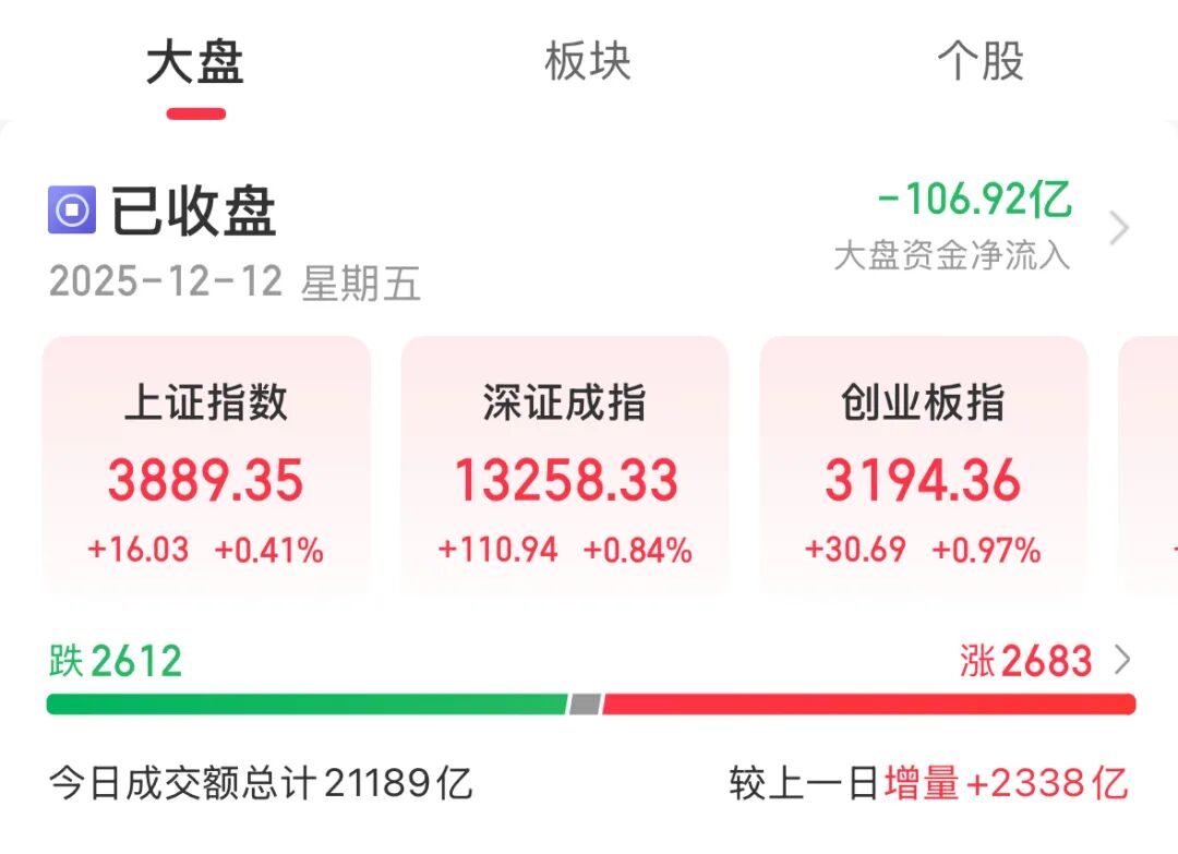 A股收盘,三大股指普涨,全市场成交额超2.1万亿元,较上一日增量2338亿元。