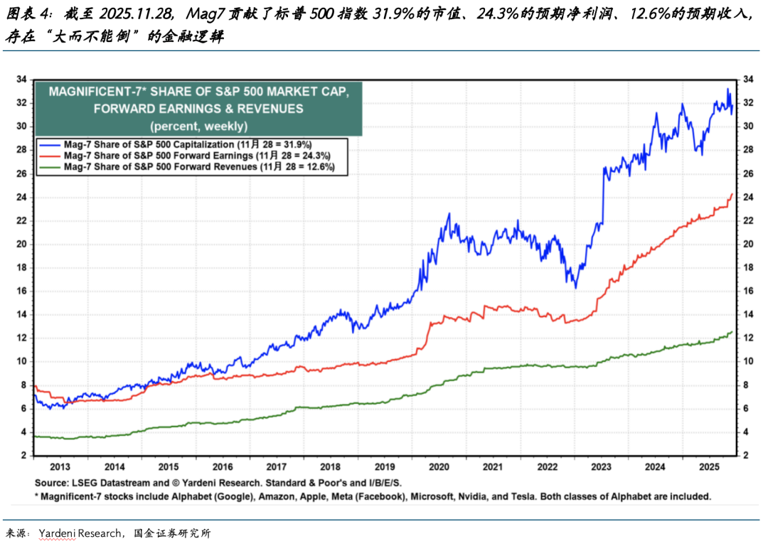 人工智能产业可分成芯片商、云服务商和模型商三个层级。近一年里,上述三个层级内的企业涌现出多个跨层级的巨额投资交易。尽管这些合作有助于整合产业链资源、改善芯片供应、算力支持和应用场景,但也可能造成需求假象,造成产业链的脆弱性。如果AI巨头自身的业务盈利预期无法产生足够利润与现金流,同时流动性环境边际恶化时,整个链条可能因“信仰受损”而面临较大风险。