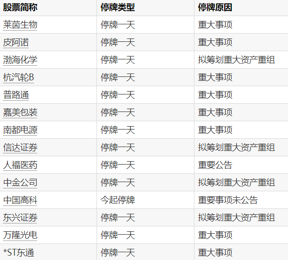 数据显示,12月15日,莱茵生物、皮阿诺、渤海化学等14只个股停牌。