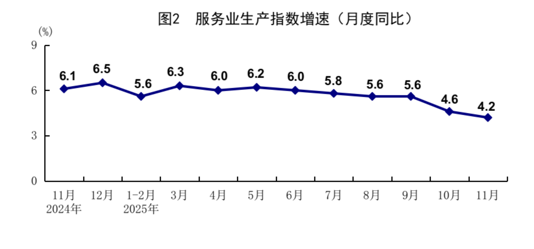 11月份,全国服务业生产指数同比增长4.2%。分行业看,信息传输、软件和信息技术服务业,租赁和商务服务业,金融业生产指数同比分别增长12.9%、8.4%、5.1%,分别快于服务业生产指数8.7、4.2、0.9个百分点。1-11月份,全国服务业生产指数同比增长5.6%。