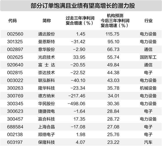 今年以来,受益于行业景气度提升、“反内卷”行动持续推进以及自身产能释放的三重利好,不少公司后续业务成长确定性高,呈现出产品排期长、订单充足等特征。今年11月以来,上市公司通过投资者互动平台等公开渠道表示自身订单饱满或订单充足(含“行业景气度高”),据证券时报·数据宝不完全统计,这一类公司有77家。从行业分布来看,这77家公司分布于13个行业,电力设备、机械设备、电子行业数量居前。其中电力设备行业公司数量超过20家。这些公司订单充足的原因主要有三方面:一是受益于下游需求带动,与锂电、电解液、储能、铅酸蓄电池,以及与半导体相关业务的订单数量提升;二是受益于机器人零部件,以及航空零部件客户订单需求的提升;三是受益于公司自身持续提升运营效率,强化市场开拓。结合业绩成长性来看,上述77家公司中,以机构一致预测2027年净利润中值来计算,今后三年净利润复合增速超过过去三年的复合增速,且年内市场表现跑输所属申万一级行业指数涨跌幅的公司有19家。