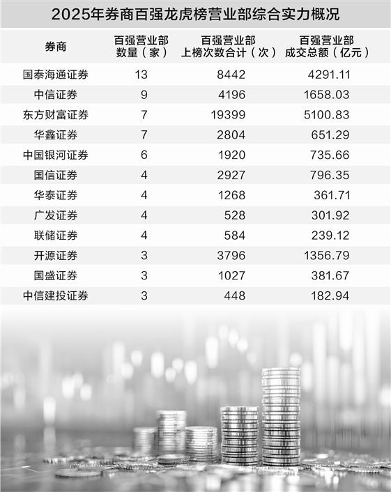 从券商龙虎榜营业部综合实力来看,国泰海通证券、中信证券、东方财富证券的百强营业部入围数量位居行业前列。国泰海通证券在2025年表现尤为强势,13家百强营业部合计上榜次数达8442次,成交总额高达4291.11亿元。