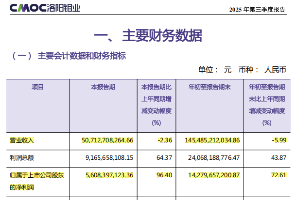 业绩方面,据洛阳钼业10月24日发布的业绩公告,今年前三季度,公司实现营业收入1454.85亿元,同比减少5.99%;归属于上市公司股东的净利润超越2024年全年业绩,达142.8亿元,同比增长72.61%。