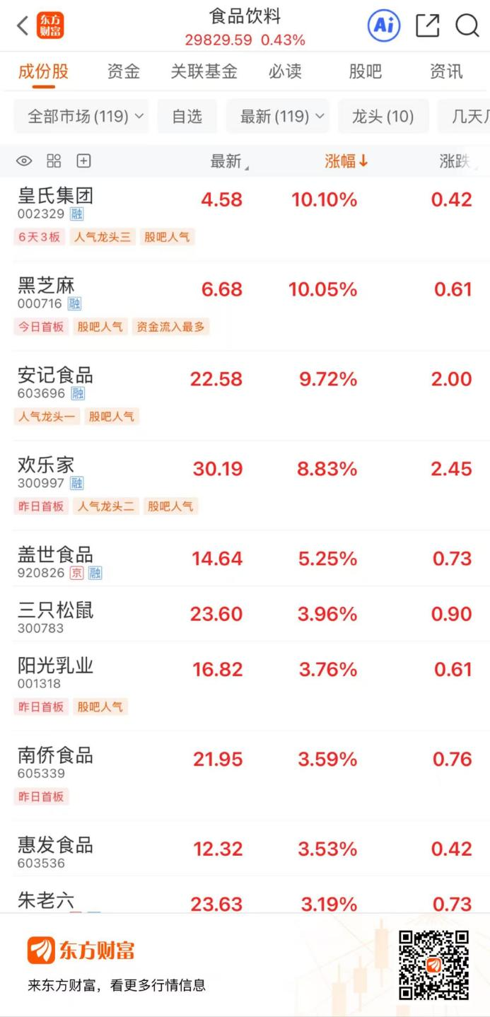 12月16日,A股三大指数调整,食品饮料板块逆势拉升多股异动。截至早间收盘,皇氏集团、黑芝麻涨停,安记食品涨超9%,欢乐家涨超8%,盖世食品涨超5%,三只松鼠、阳光乳业、南侨食品、惠发食品、朱老六等多股涨超3%。