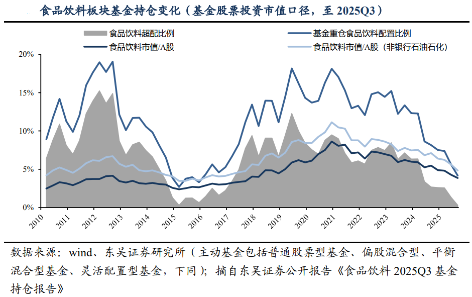 “蓝筹泡沫”阶段结束,筹码结构优化、市盈率处于相对低位。2021年至今,头部企业回调幅度充分,叠加业绩兑现,板块市盈率回到历史区间低位;截至2025Q3板块整体接近平配,扣除头部标的后板块呈现低配。