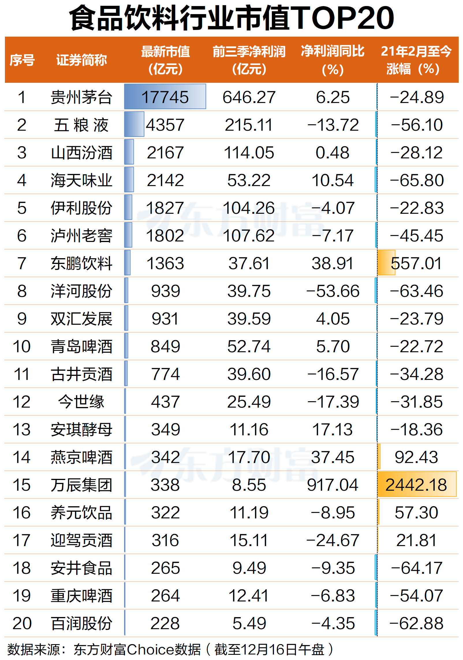 具体来看,上涨的2只股票分别是2021年4月上市的万辰集团和2021年5月上市的东鹏饮料。下跌的食品饮料股中,海天味业、安井食品、洋河股份、百润股份跌幅最大,均跌超60%。五粮液、重庆啤酒跌幅居前,均跌超50%。