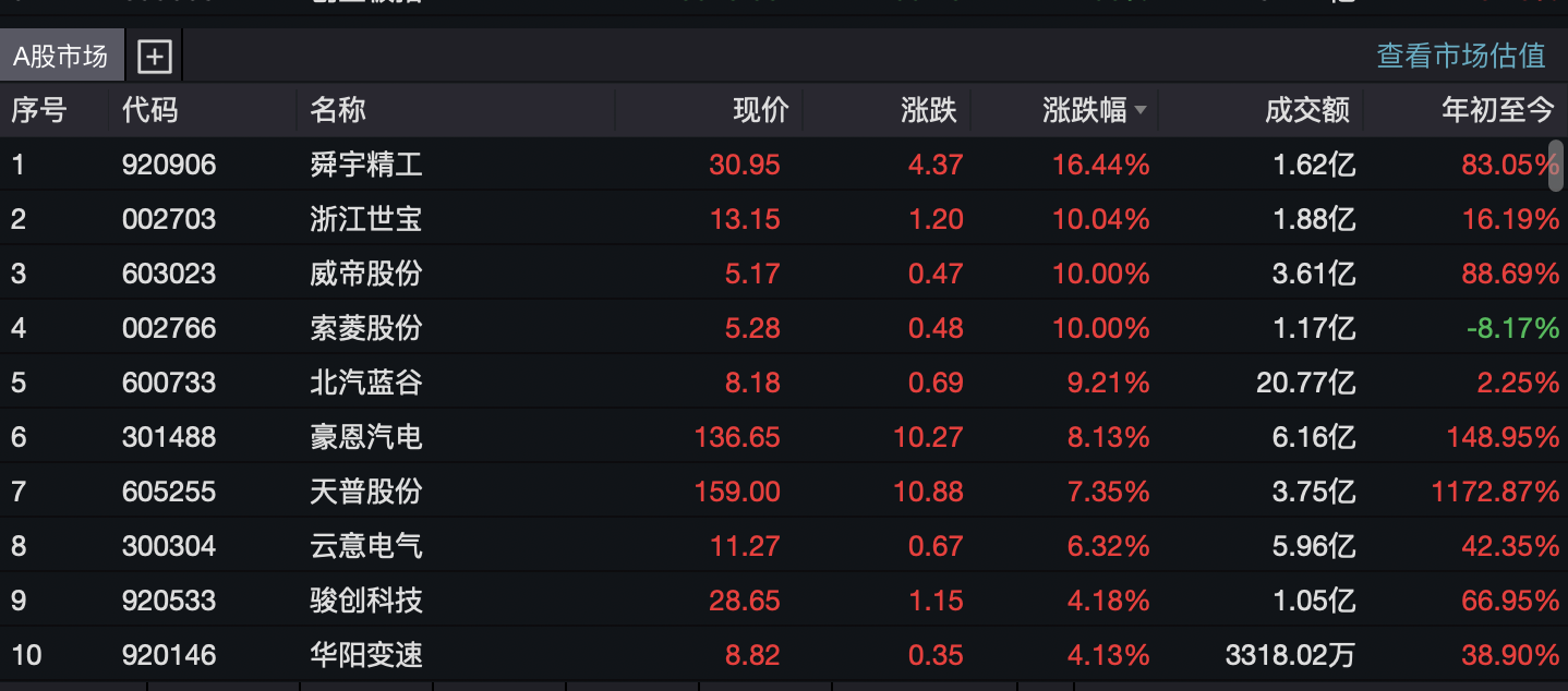 具体来看,数据显示,汽车与零部件板块多股大涨,截至记者发稿时,成分股中浙江世宝、威帝股份、索菱股份3股涨停,舜宇精工涨超16%,豪恩汽电、北汽蓝谷、天普股份等多股跟涨,北汽蓝谷逼近涨停。